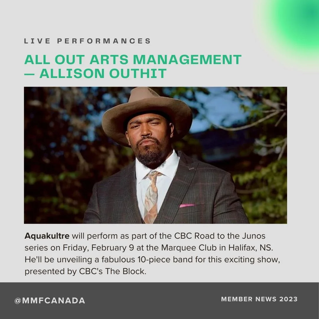 Have news or media coverage to share? You can also submit your artist and company updates to us via Google form here for possible inclusion in an upcoming round-up and newsletter. Please note that you must be an MMF Canada member to submit.